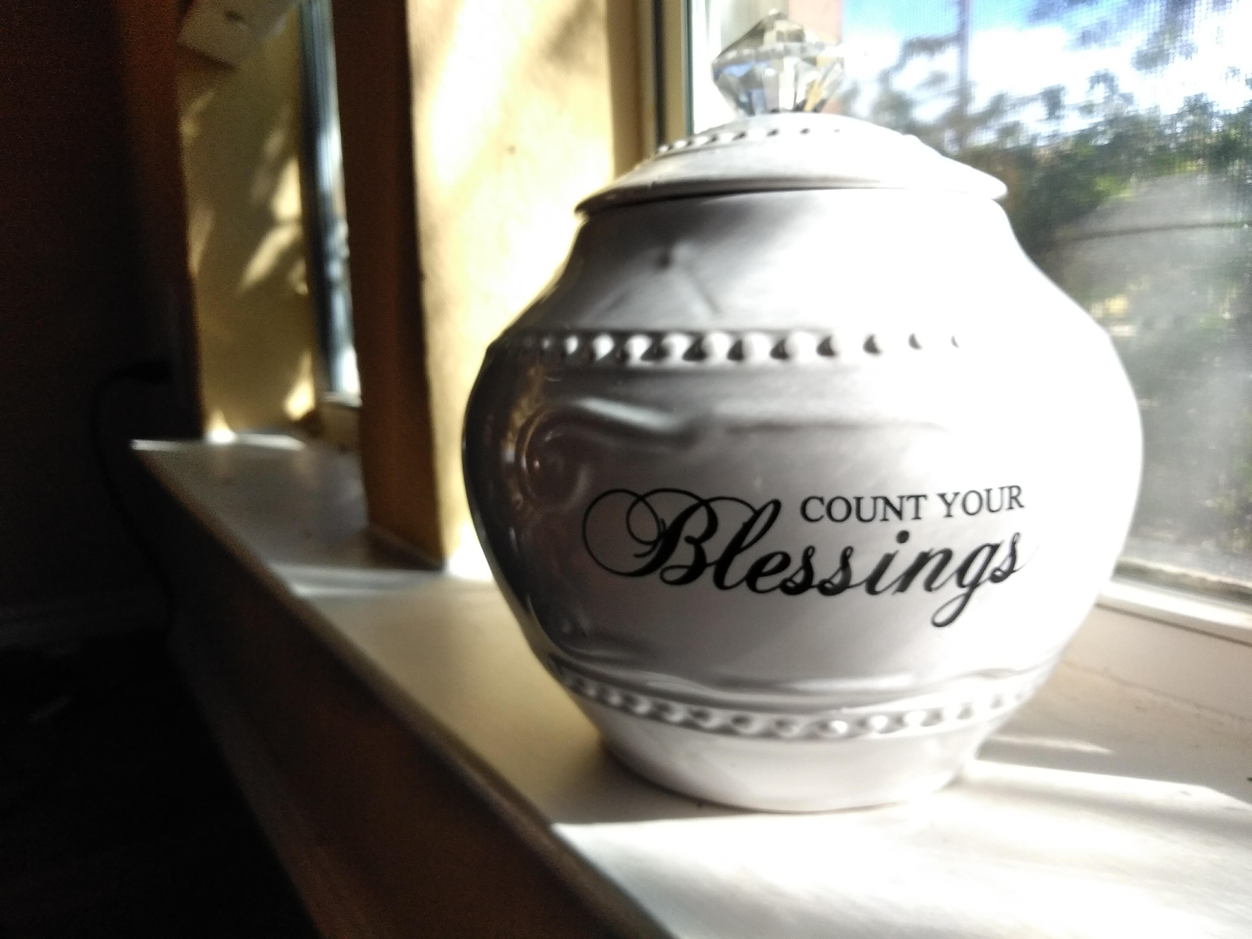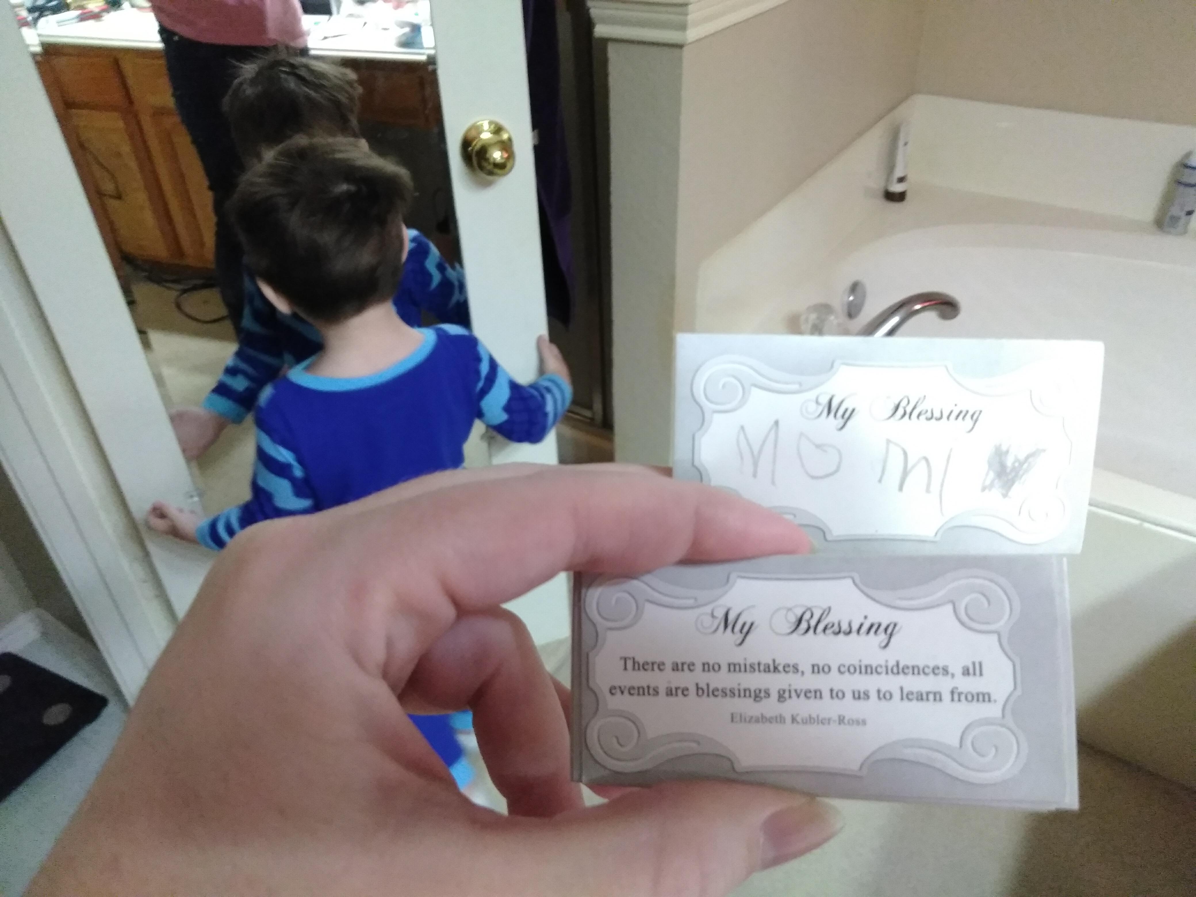 As if to reinforce the Herculean task before me, Austin found my special blessings jar. I had kept it safely up on the high shelf until a couple of days ago, I thought I could sneak it down to the accent table in my room. He tossed it up on the bed, and together we read a few of the cards. I should have taken it away and put it on the high shelf, but I was feeling adventurous and decided to watch him remove the jewel handled jar lid and his eyes light up as he discovered a new treasure inside. He took the jar off the bed, toddled a few steps, tripped over a pillow, and the jar went down.