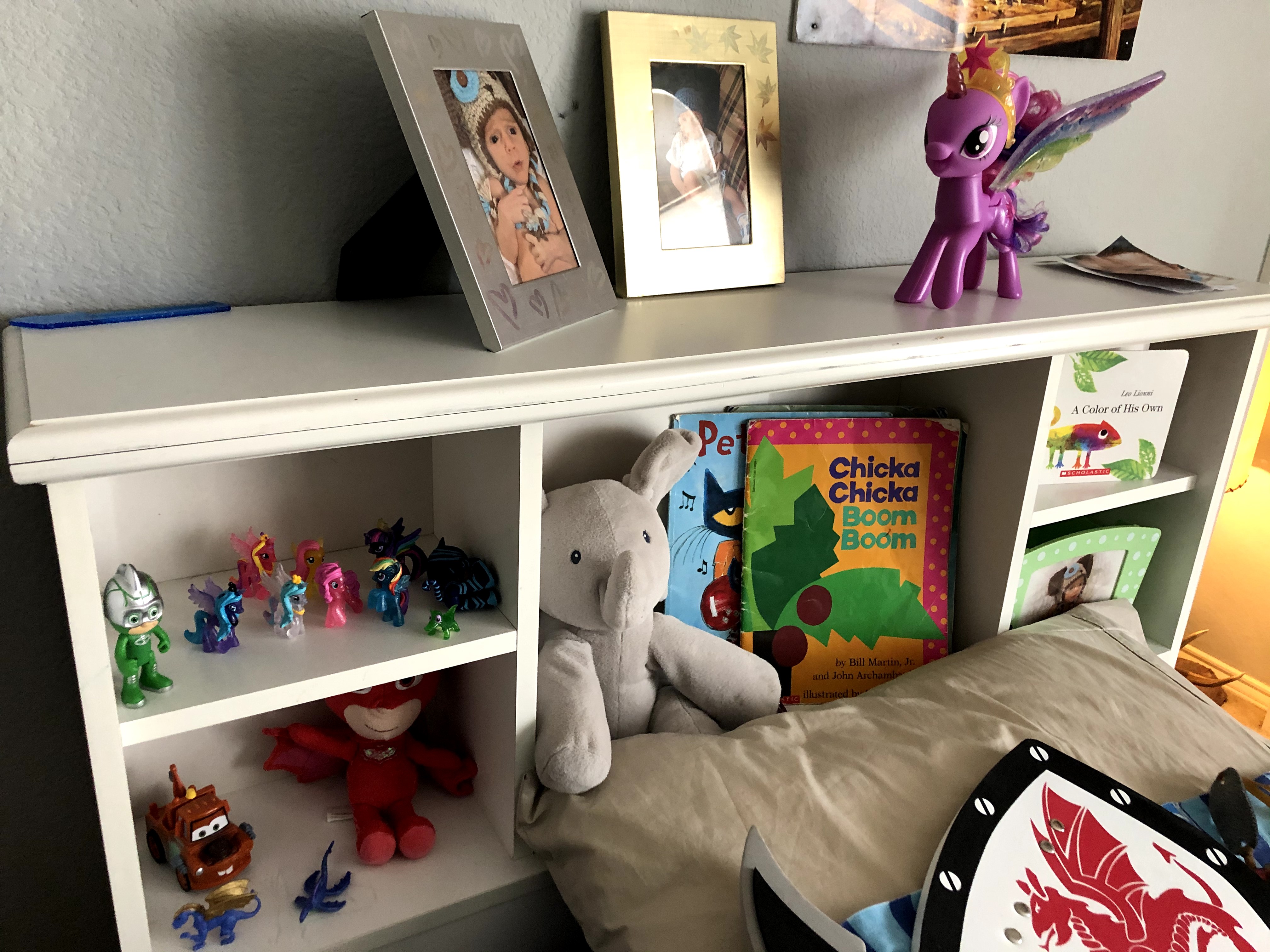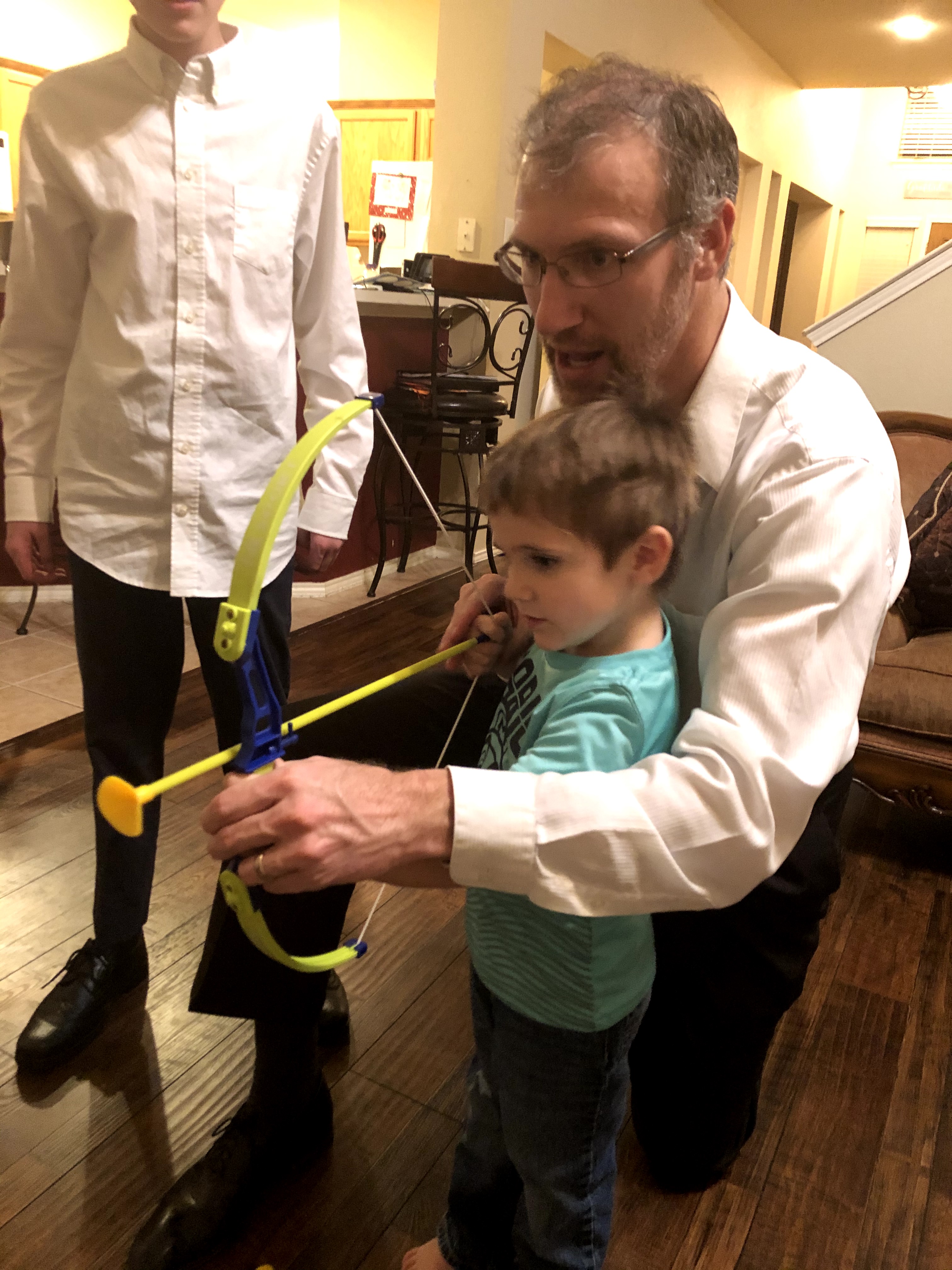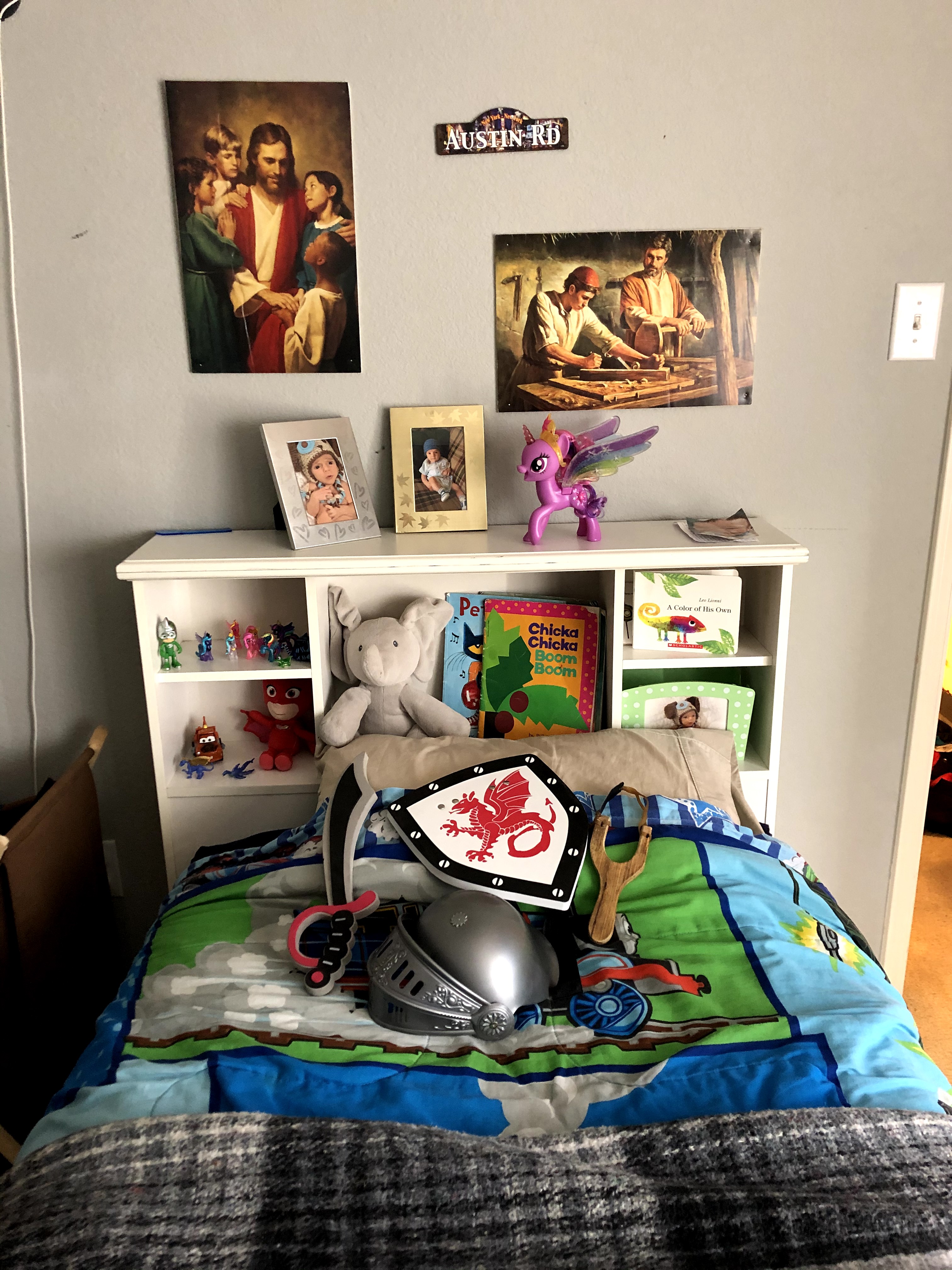 And he did get a complete set of My Little Pony figurines for his birthday. He knows all of them by name. He sleeps with them next to his bed. He did get a glorious Twilight Sparkle Pony complete with glittery wings and tiara, much to the chagrin of his dad. I think Wesley kind of likes it though. I even saw Layne messing with her wings. It stands out as the first and only “girl toy” we have had in our house, so it is something of a novelty. He also got eight foam swords, two shields, and a set of bow and arrows.