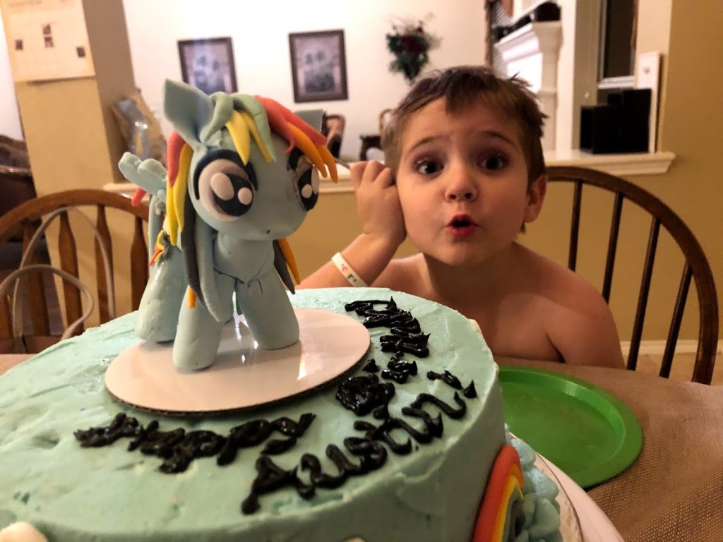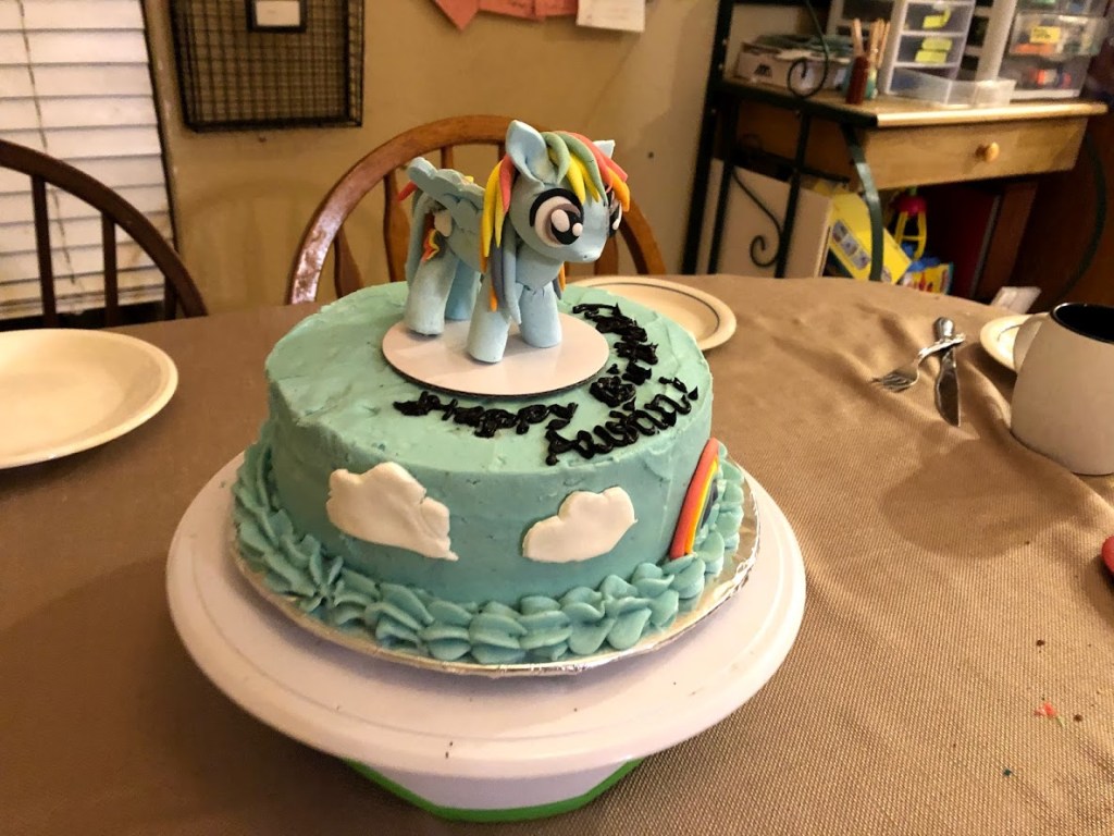 I HAD TO MAKE THIS CAKE TOPPER WORK! Who makes a My Little Pony cake topper for her son’s birthday party? To have it turn out lame was not an option. Imperfect? Yes. Lame? No. All my older boys and Ben were like, “You are going to make him a girl cake???” I was so MAD!! I am not making him a GIRL CAKE. I am making him a cake of a character he loves who happens to be female. She is also fast and can fly and has a spunky personality and maybe he will marry someone like that someday. I LOVE the fact that he relates to female characters and admires them! Someday I hope he can take that and build a relationship or relationships with his female coworkers and spouse that is devoid of the toxic sexism that saturates our society!! This was not about a cake. It was a STATEMENT. And it was not working.