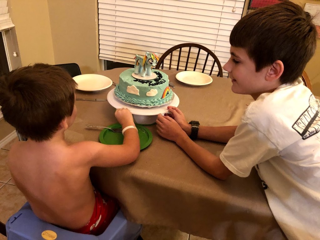 Ben found a recipe online for edible glue. He got the ingredients and mixed them up for me. It worked like a charm. I set the troublesome topper on the cake and then piped a border around the bottom. Wesley and I worked together to make rainbows and clouds to go around it. It was beautiful! It wasn’t a “girl cake” but it did have a female pony who has earned the love and respect of my tiny warrior.